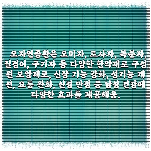 오자연종환은 오미자, 토사자, 복분자, 질경이, 구기자 등 다양한 한약재로 구성된 보양제로, 신장 기능 강화, 성기능 개선, 요통 완화, 신경 안정 등 남성 건강에 다양한 효과를 제공해용.